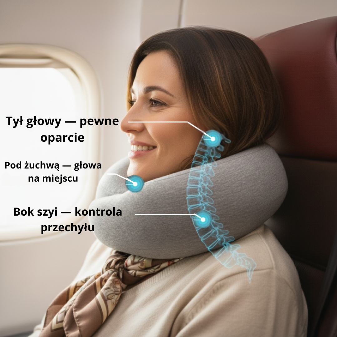 Stabilne podparcie głowy i mniej napięcia szyi — od pierwszych minut lotu czy jazdy. Zamów dziś z darmową dostawą i 60-dniowym zwrotem, bez ryzyka.